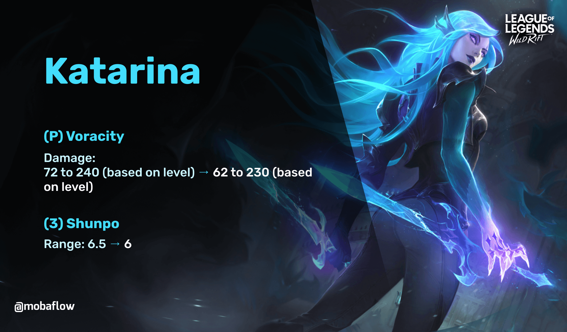 This champion is an absolute mostrosity. She is one of those champions that can very unexpectedly pop off in team fights and good Katarina players can always find ways to do that every team fight. She deserves way more nerfs than these because her passive deals an excessive amount of damage at every stage of the game, but I am happy for now. This is a step in the right direction.